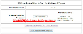 14. Pilih Liberty Reserve dan klik "Start My Withdrawal Request". Perlu anda ketahui adanya withdrawal fees / biaya withdrawal untuk masing-masing payment processor.
